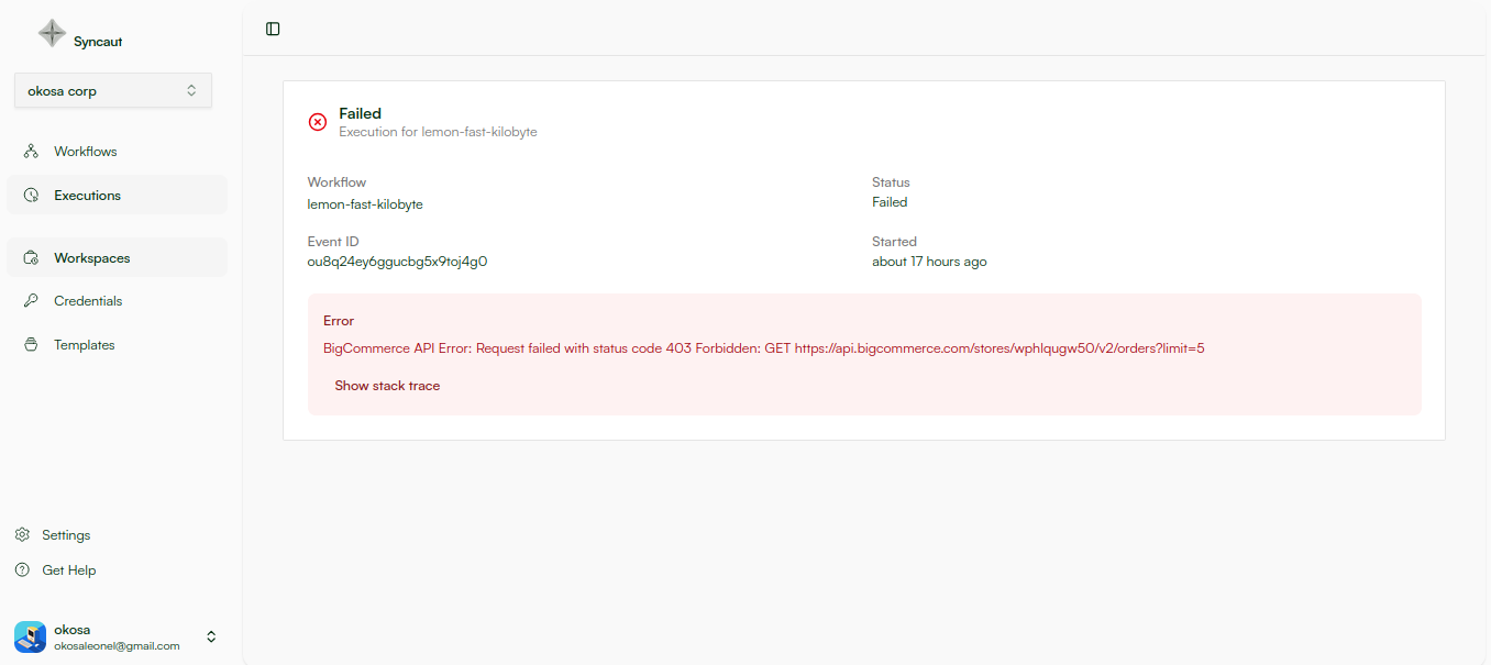 When a workflow fails, Syncaut provides tools to help you identify and resolve the issue.